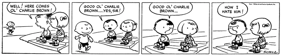 CMJ: You know, the very, very, very first Peanuts comic strip, when it was Shermie who was the main character, and an early Violet or Lucy prototype; they’re sitting on a stoop, and Charlie Brown walks by, and they say, “Good ol’ Charlie Brown. Good ol’ Charlie Brown…Yes, sir! How I hate him.”